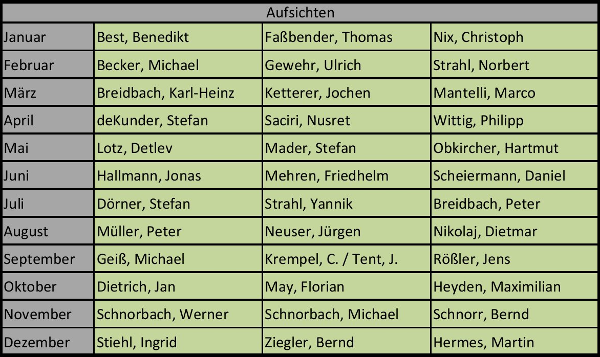 Die Einteilung der Aufsichtspersonen bezieht sich auf die Sonntage zwischen 09:00 und 12:00 Uhr.